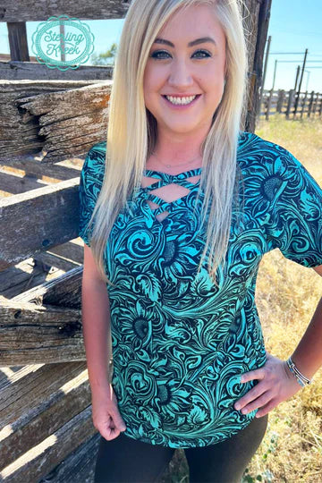 This top is so fun! The criss-cross v-neck is so flattering on all body types! This also features a fun and bright pattern of turquoise tooled leather! Perfect to stand out in a crowd!
