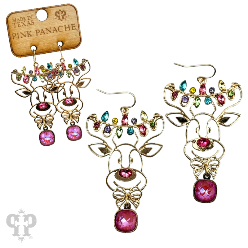 Pink Panache Gold and rhinestone reindeer earring with Austrian crystal: Pink