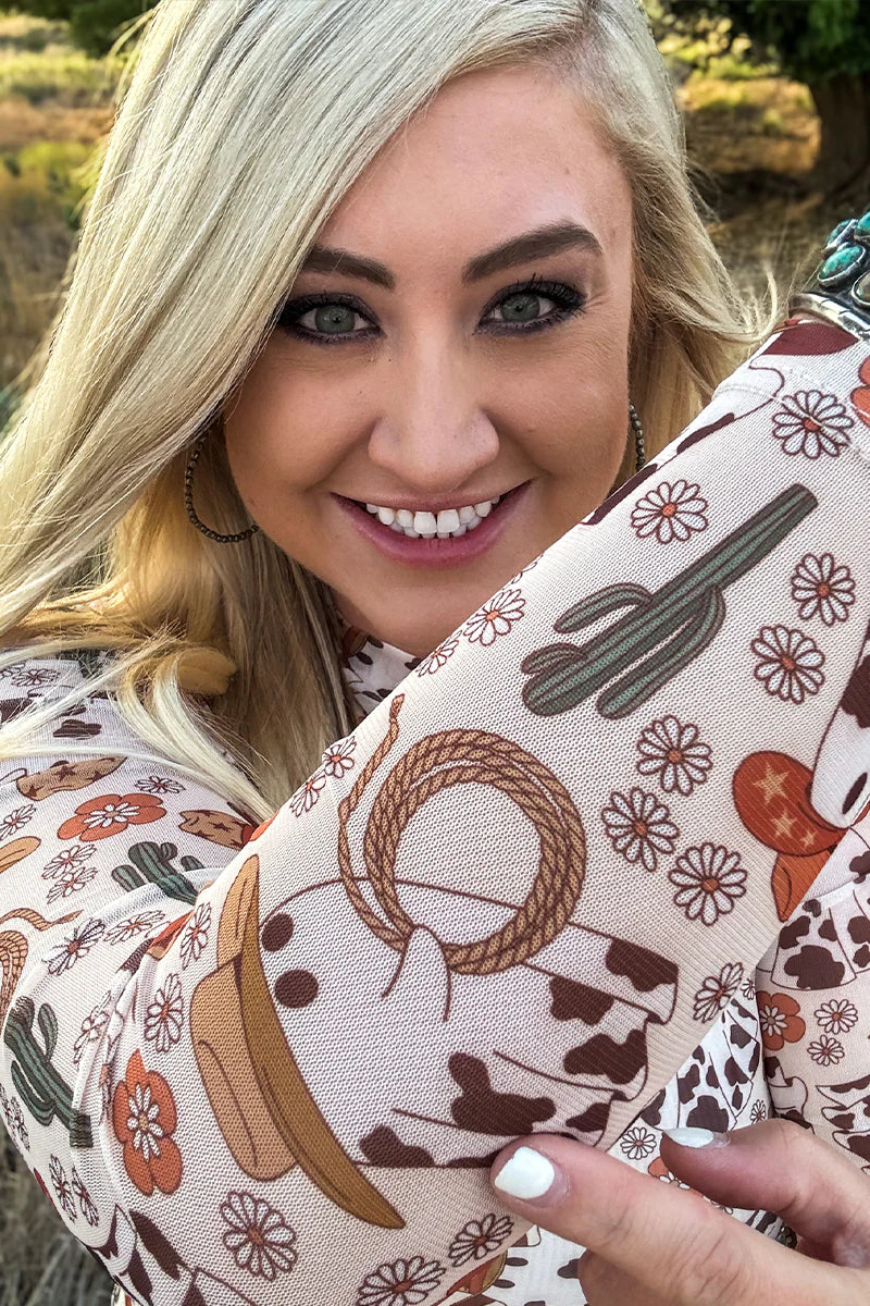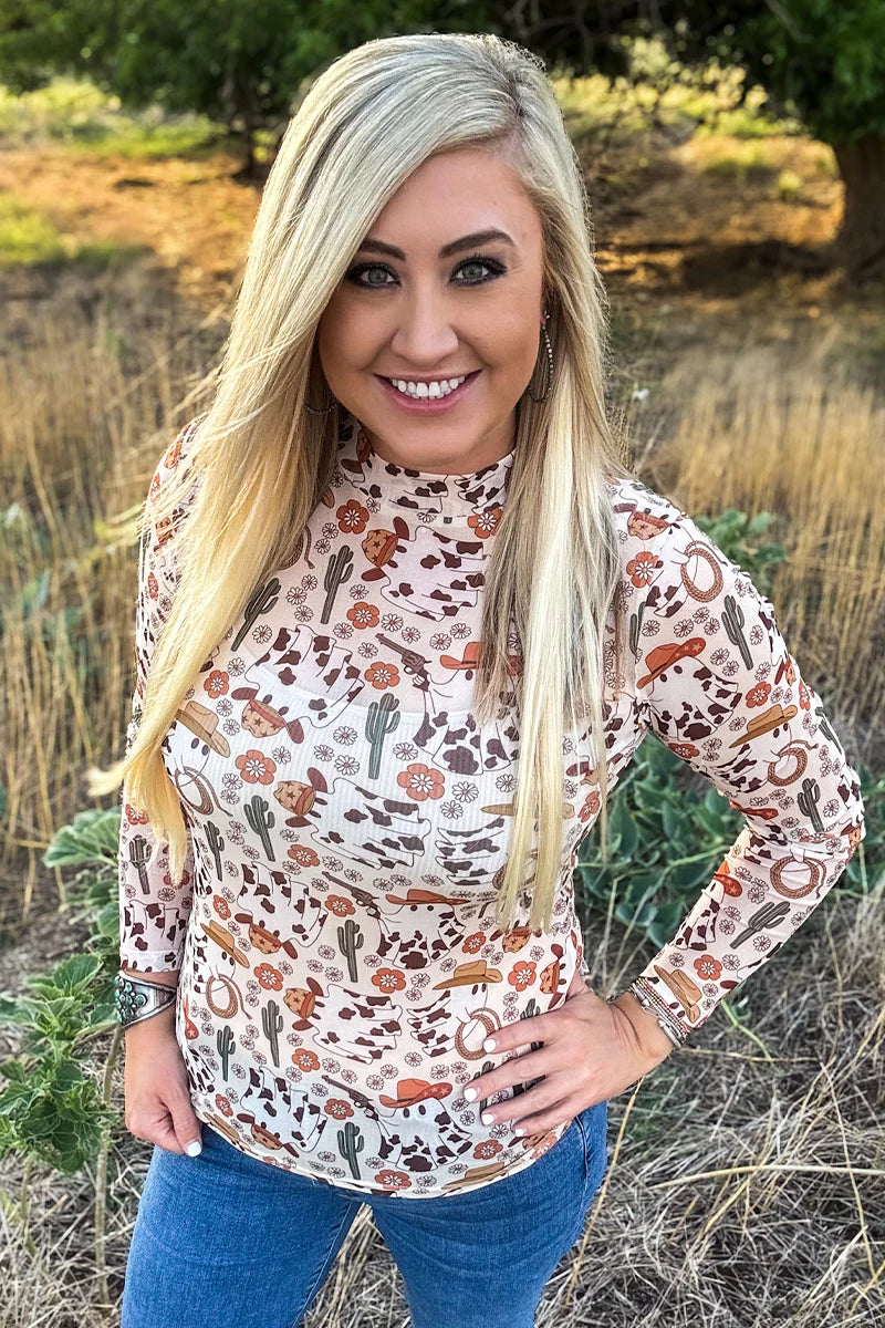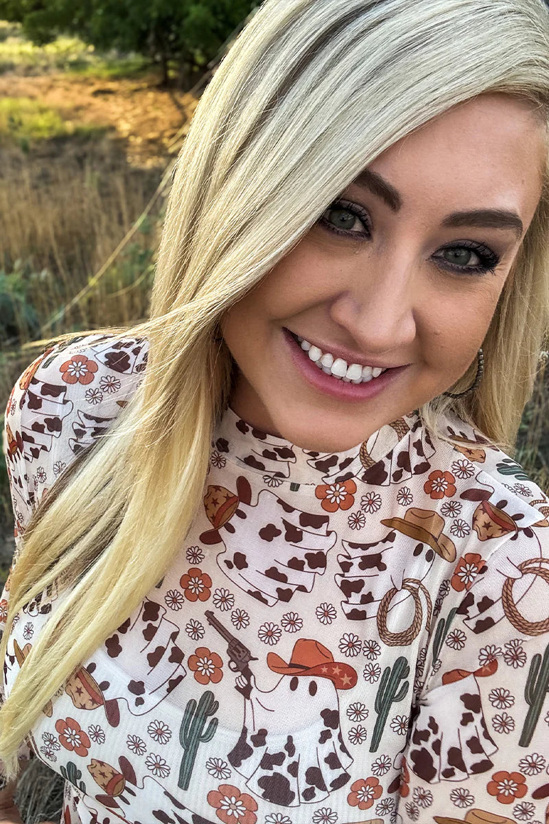 Embrace the wild spirit of the West with the Hauntin' The Range Mesh top. Featuring a unique ghost design adorned with cow prints and cowboy hats, complemented by cacti and rope details, this top blends spooky charm with rugged style. Its breathable mesh fabric ensures comfort while making a bold statement, perfect for those who want to stand out with a playful, western-inspired look.